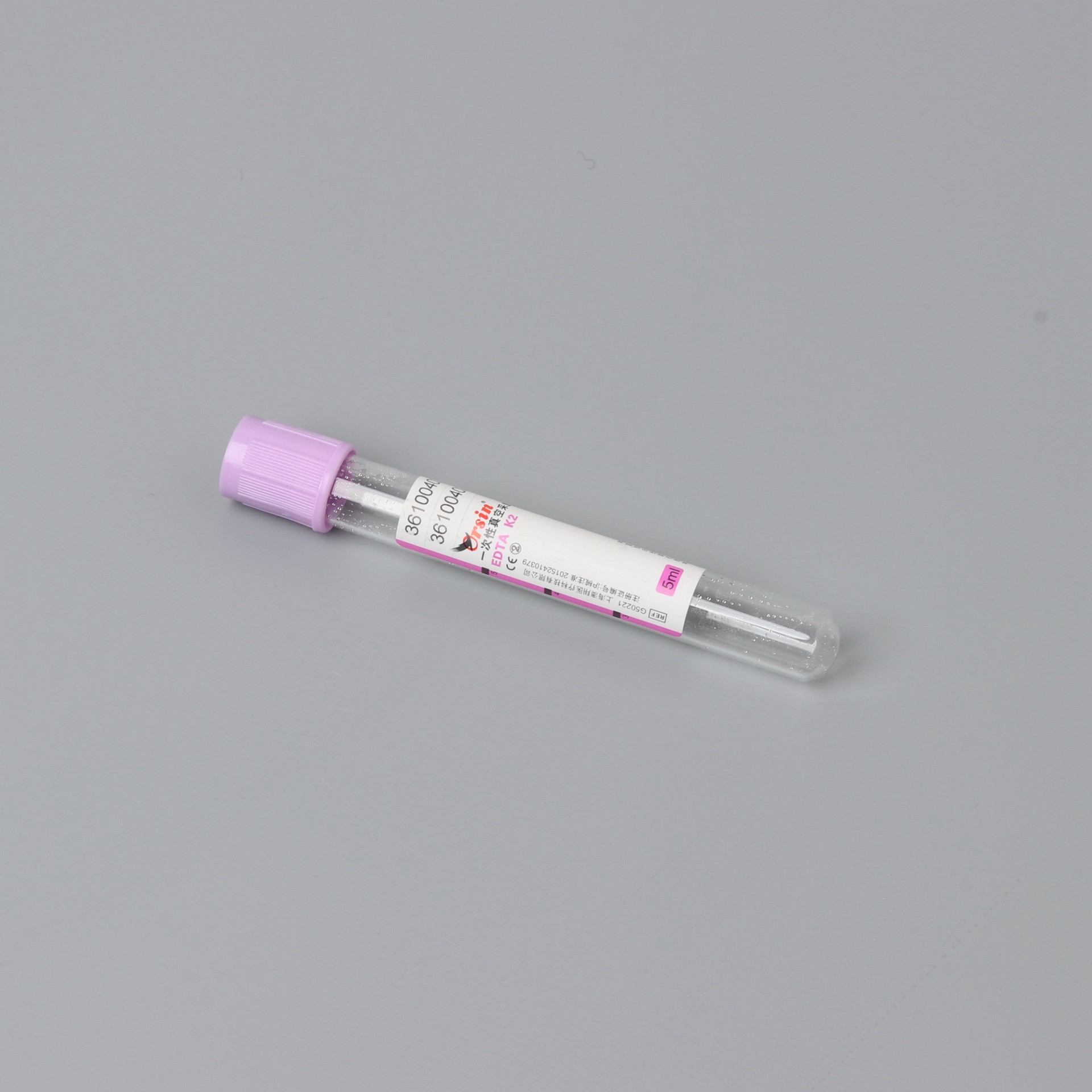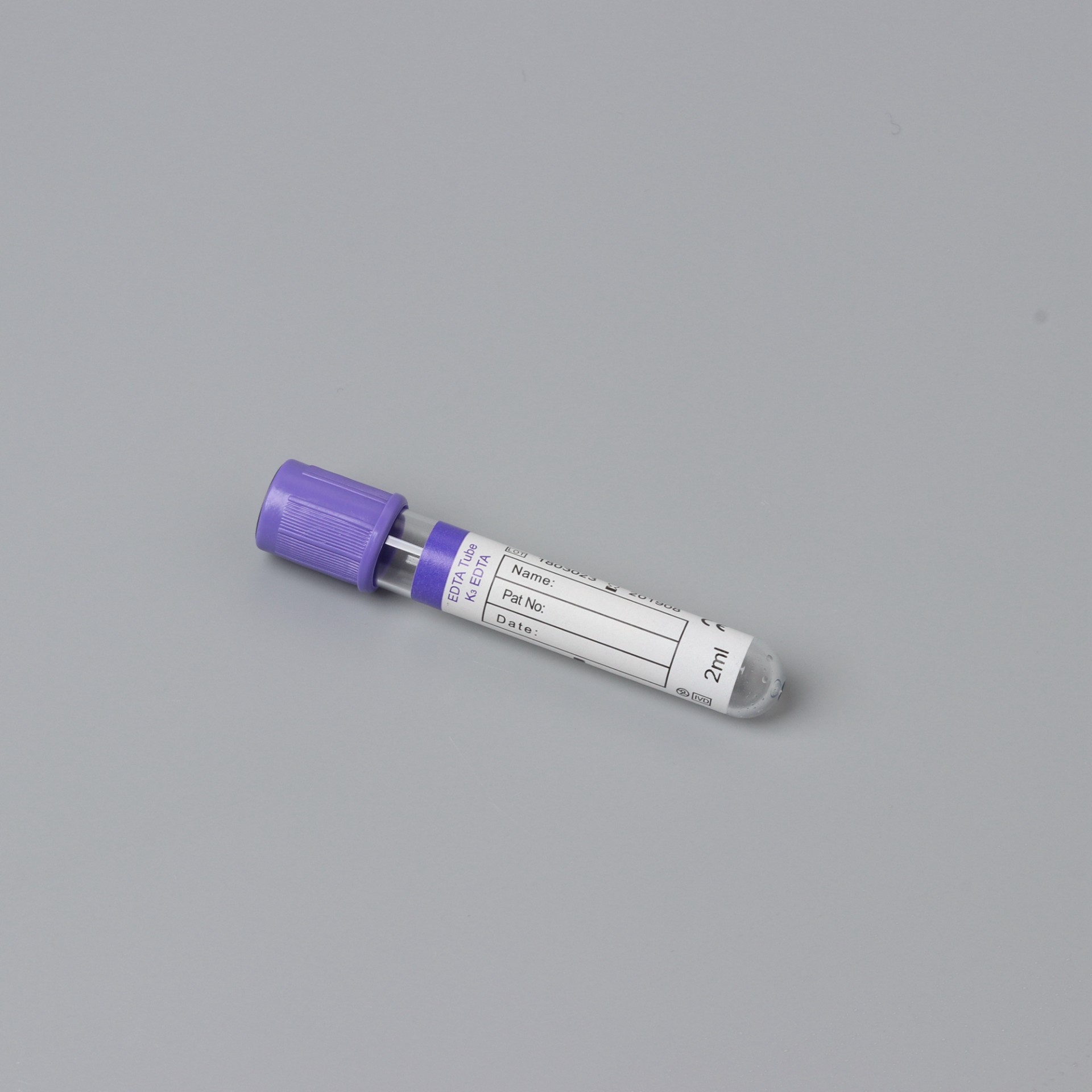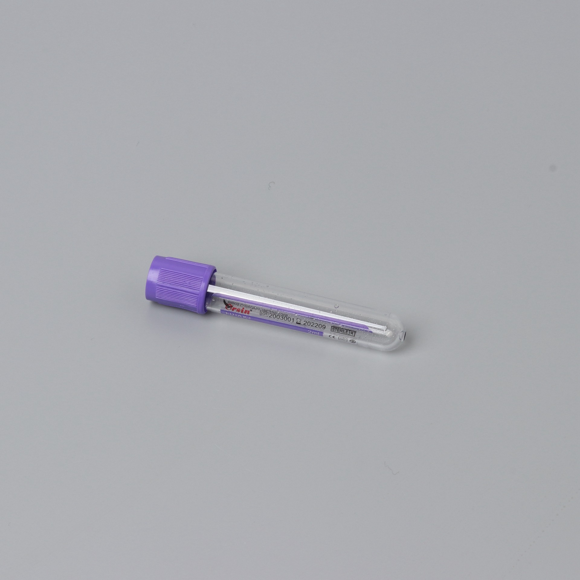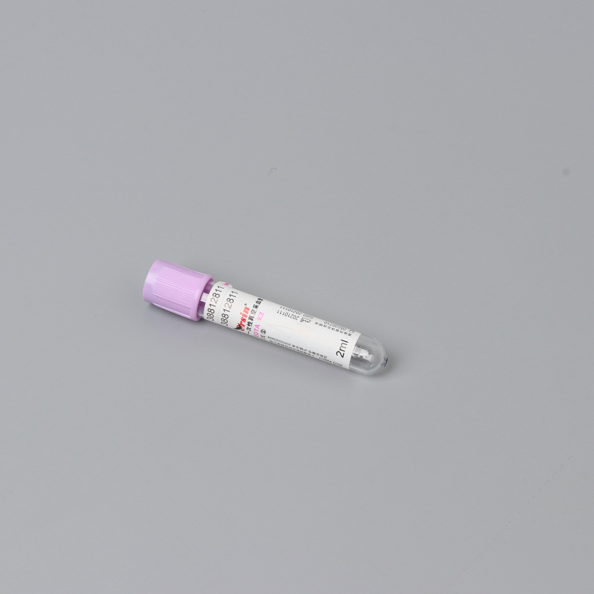 紫头管中的抗凝剂为 EDTA 盐。国际血液委员会推荐使用抗凝效率较高 , 稳定性更强 , ph 值与血液相对接近的乙二胺四乙酸 · 二钾(EDTA.K2)。 独一无二的内壁仿生活性膜处理 , 有效地维持了血小板的活性稳定。微喷雾技术的运用降低 了因血小板黏附与聚集而发生血小板损失和凝血的风险 ,严格的微粒污染控制工艺杜绝了微粒污染对检验结果的影响。 Purple cap use EDTA salt as anticoagulant. ICSH recommends using EDTA.K2, which is with higher anticoagulation efficiency, stronger stability and relatively closer ph value with blood. The unique imitated life film treatment on its inner wall can effectively maintain the active stability of platelet. The application of micro atomizing technology has lowered the hazard of platelet loss and blood coagulation caused by platelet adherence and gathering. And the rigorous particle pollution control technology has completely eradicated the impact on test result caused by particle pollution.